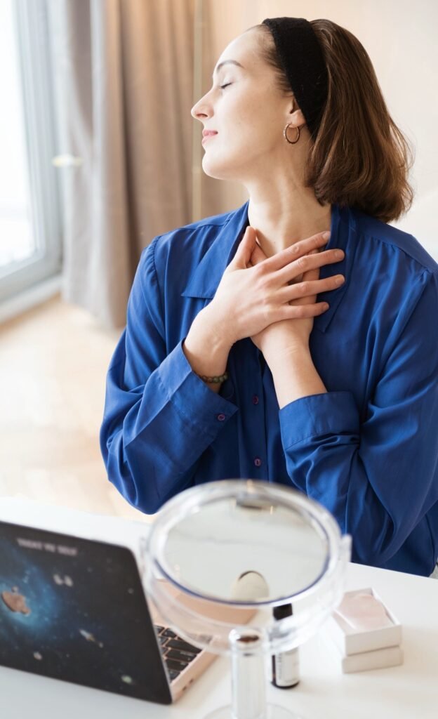 ✔ La relaxation : Même les exercices faciaux les plus efficaces à eux seuls ne font pas le poids si le stress est aigu et chronique. C’est pourquoi la respiration et la détente font partie intégrante de mon approche, et j’encourage mes clientes à réduire leur stress de manière générale.